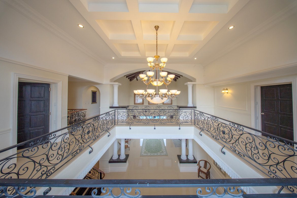 Two elegant staircases with ornate ironwork and a stunning chandelier lead to the upper level, where a bright and spacious landing offers the perfect space for artwork or a lounge area. The second floor features four bedrooms, including a sumptuous master suite with a large walk-in wardrobe and a luxurious en suite bathroom with a bathtub.