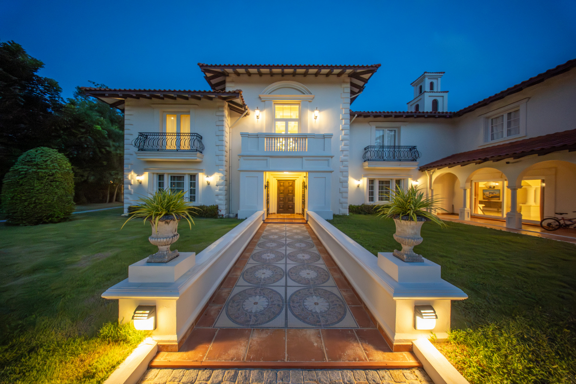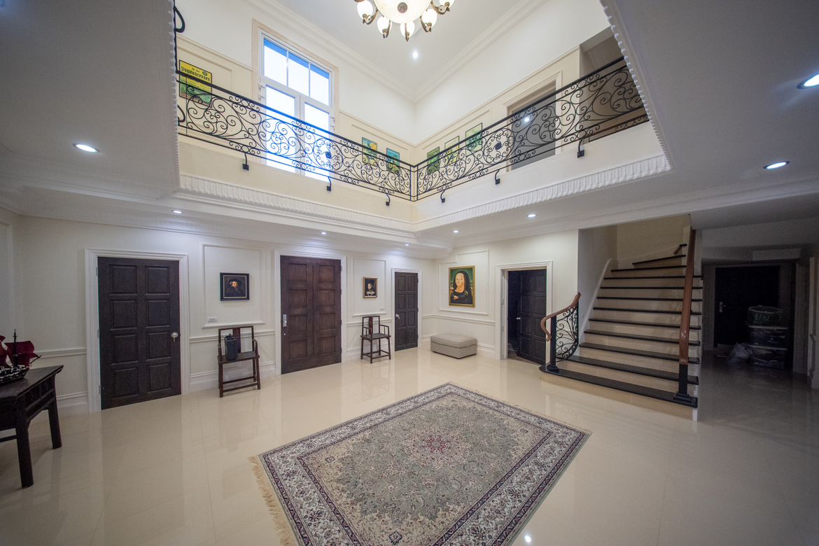 The main residence greets you with a grand entrance hall and an inviting lounge. The expansive living room and the impressive formal dining room provide a perfect setting for hosting guests. A fully equipped Western kitchen is set in a separate room, complemented by a pantry, storage, and a dedicated laundry room.
