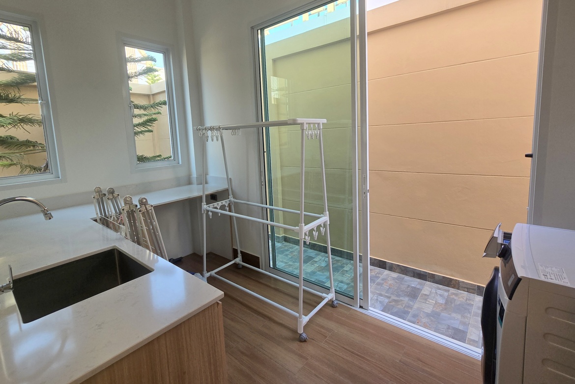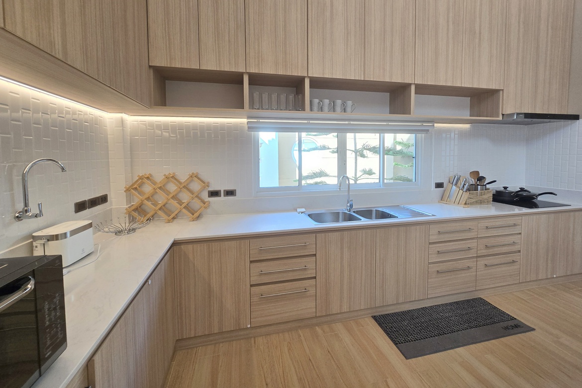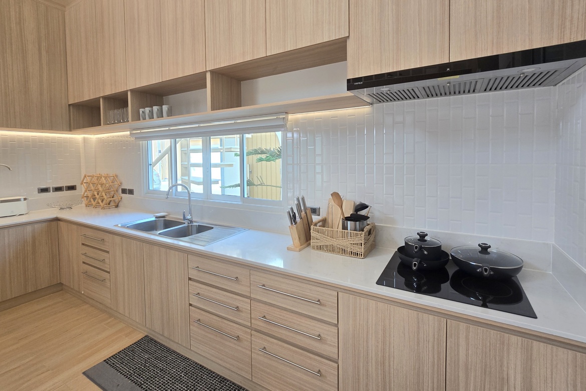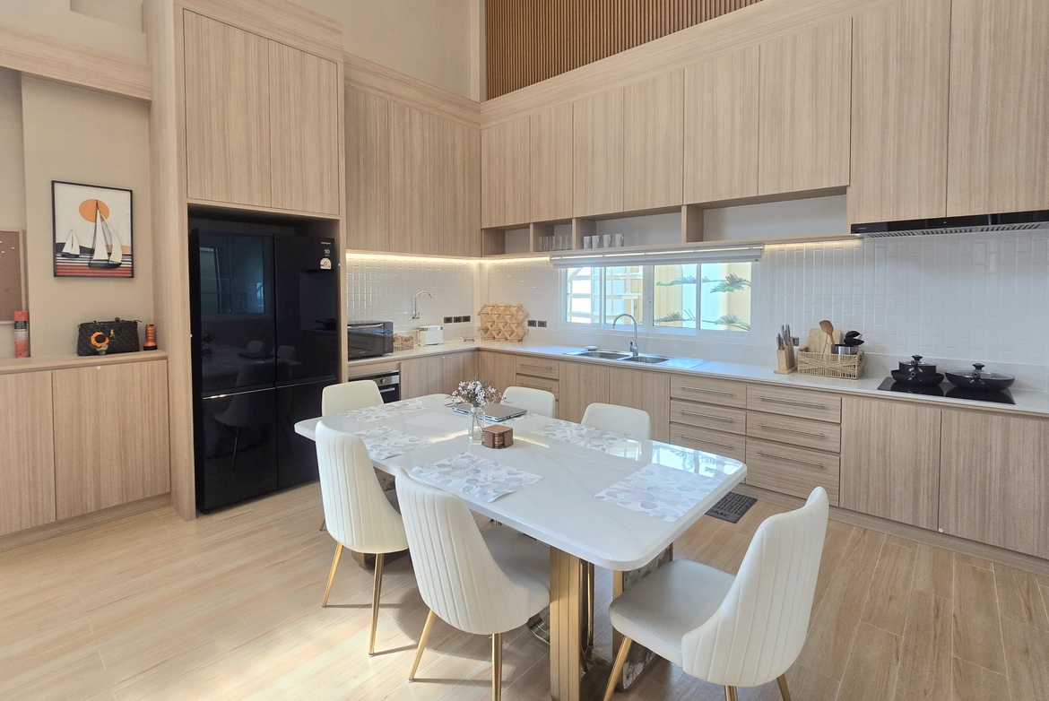 - Chef’s kitchen with a dishwasher, 4-door Hitachi fridge, and a separate Thai kitchen/laundry area.